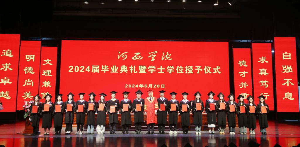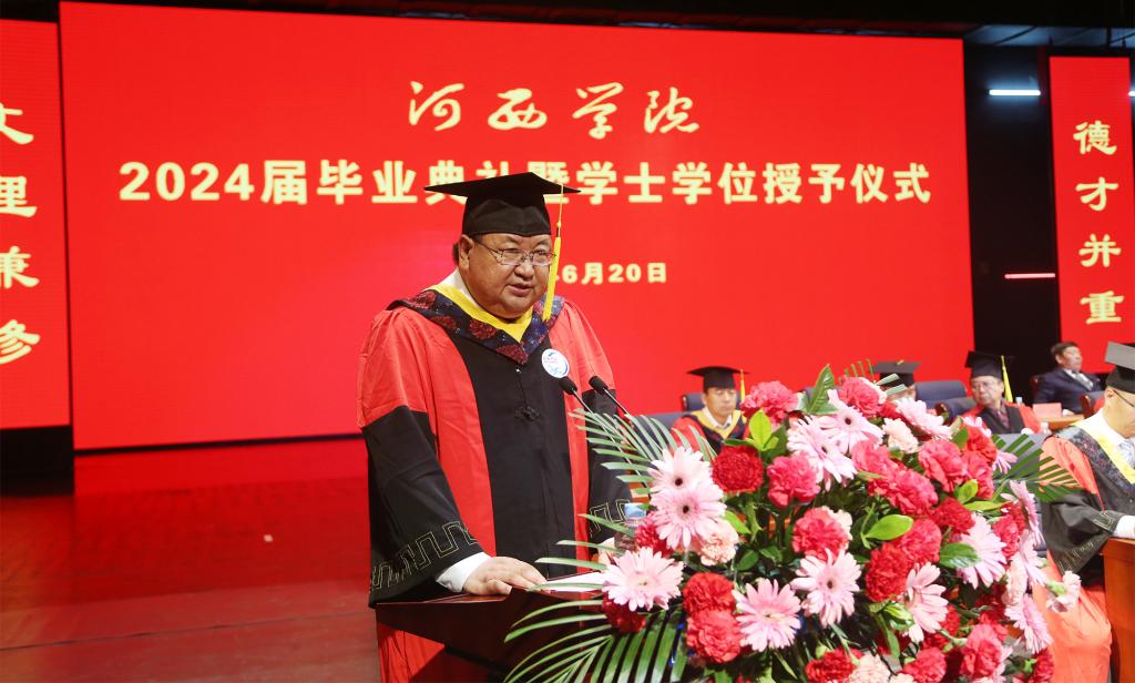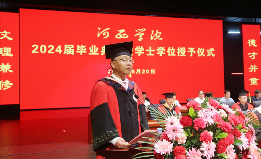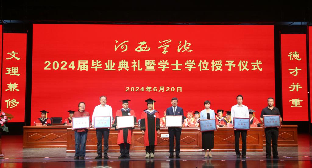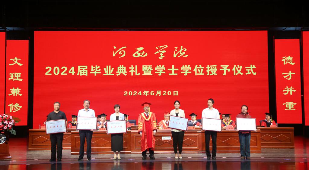 党委常委、副校长高荣宣读准予毕业和授予学士学位的2024届毕业生名单。党委常委、副校长赵柱宣读了先进集体和先进个人名单。党委书记梁兆光为获得2024届甘肃省高校优秀毕业生荣誉称号的毕业生代表颁发了荣誉证书。党委副书记、校长周勇为获得2024年考研组织工作先进单位称号的农业与生态工程学院等6个学院颁发了奖牌。党委副书记强梅为获得2023年就业工作先进集体、2023年创新创业工作先进集体代表颁发了奖牌。学校领导和各二级学院学位评定分委员会主席分别在主会场、分会场为获得学士学位的毕业生正冠拨苏。