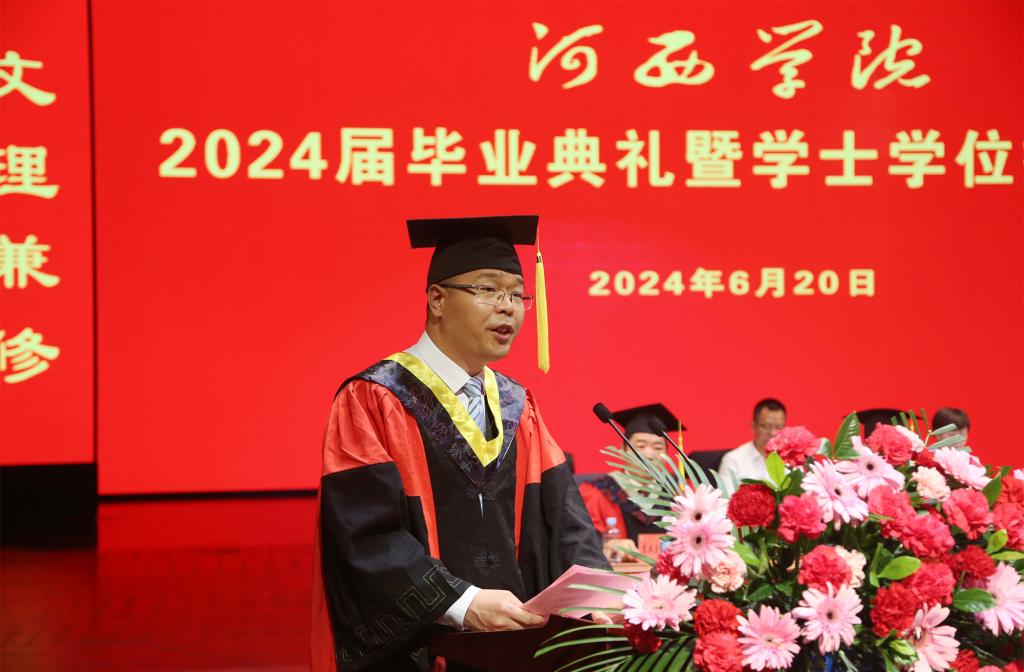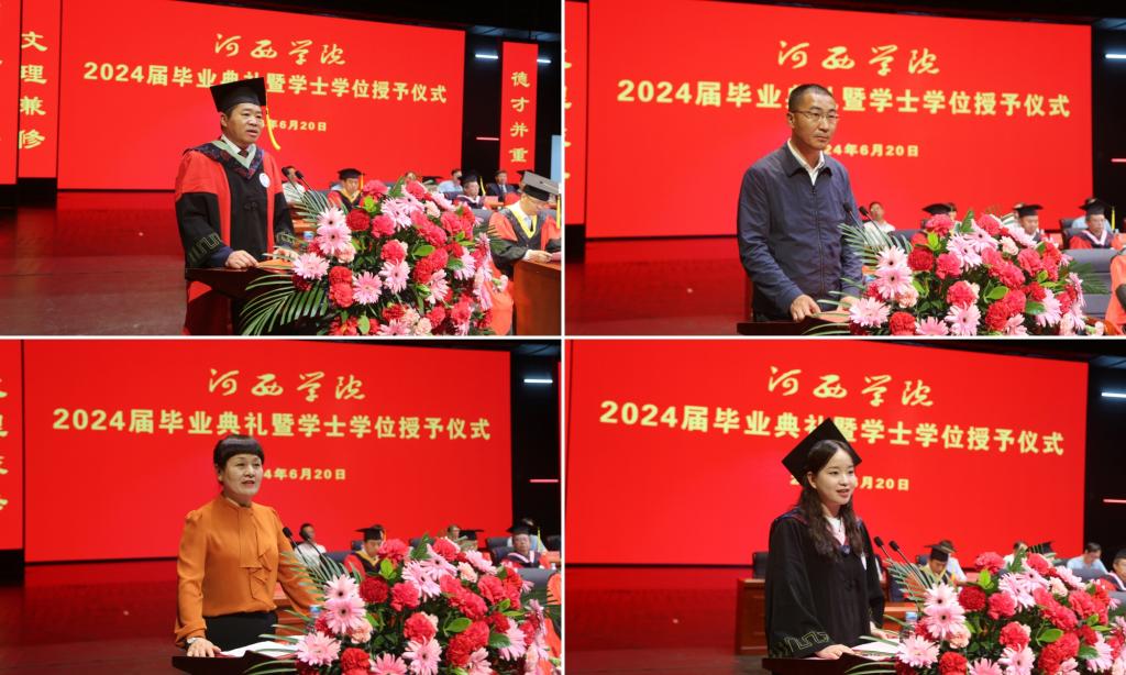 毕业生代表马克思主义学院褚洁玮代表全体毕业生感谢老师们的谆谆教诲和学校的精心培养,表示“明德尚美、求真笃行” 的校训会永远烙印在河西学子心中,“追求卓越、自强不息”的学校精神会永远激励河西学子在追求真理的道路上阔步前行。