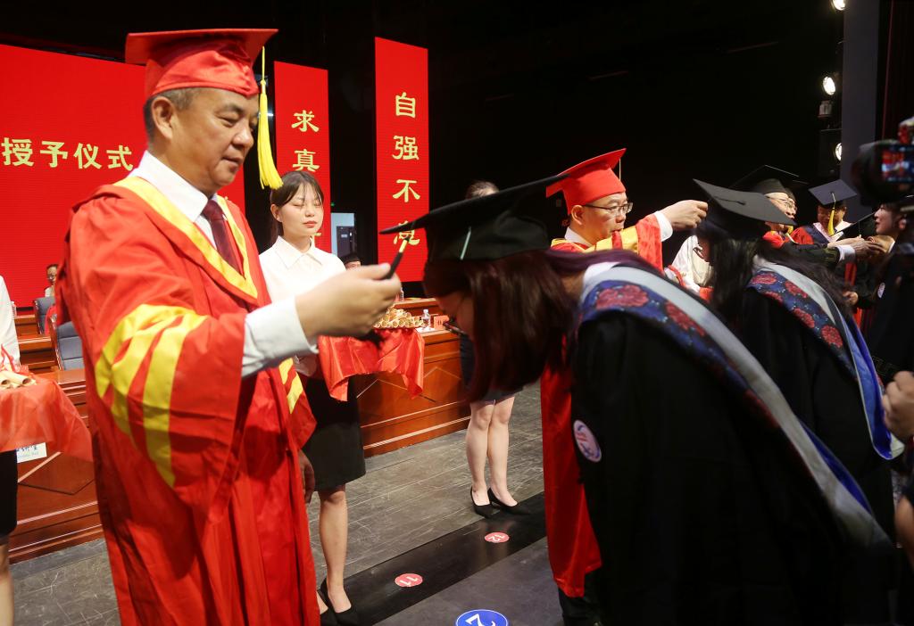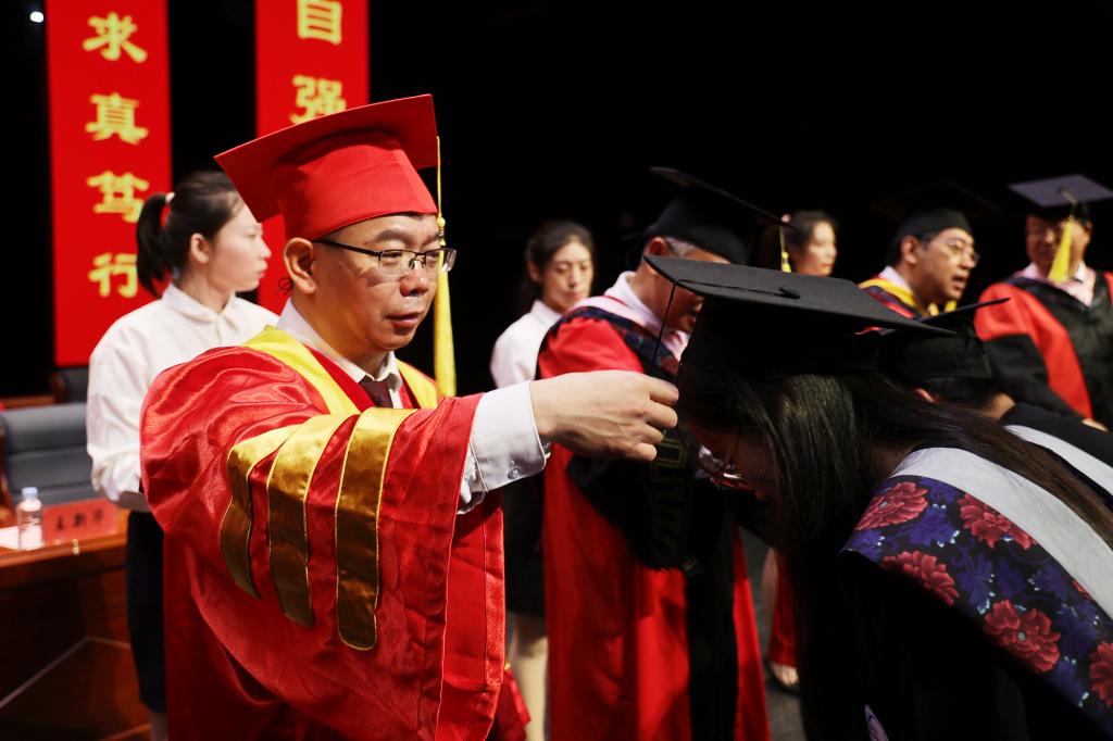 党委副书记、校长周勇为获得学士学位的毕业生正冠拨苏