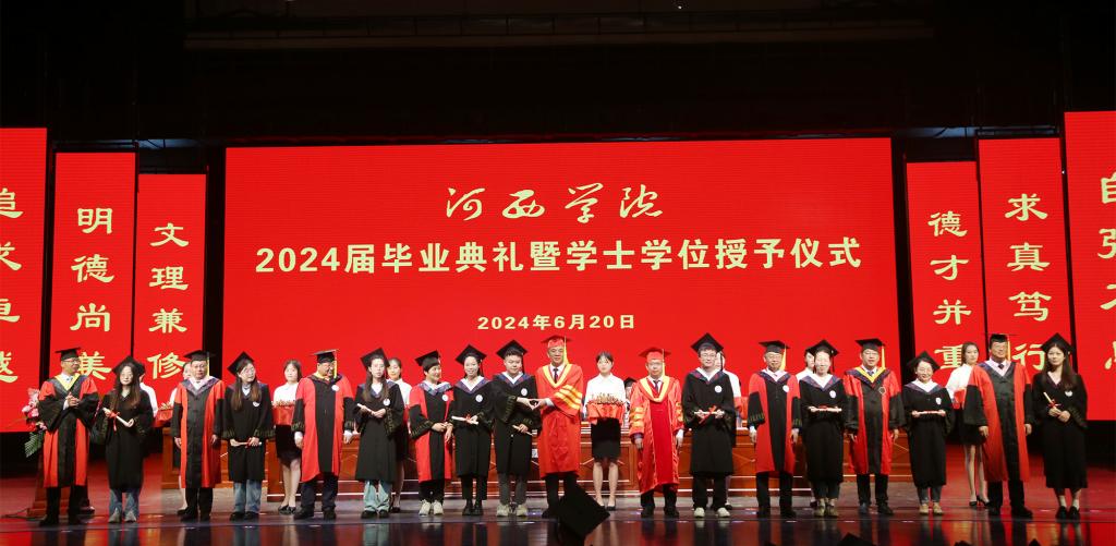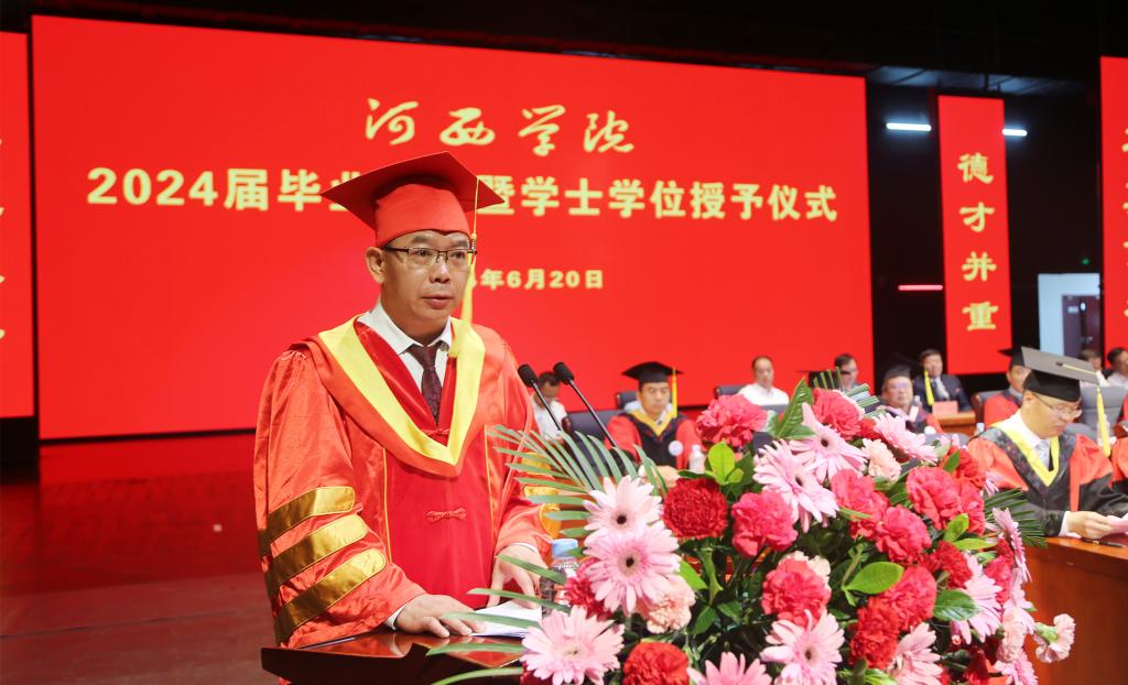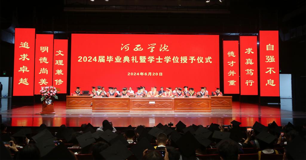 又是一年毕业季,扬帆起航正当时。6月20日上午,学校举行了2024届毕业生毕业典礼暨学士学位授予仪式。学校领导梁兆光、周勇、强梅、高荣、赵柱、王新华、唐志强,党委常委、组织部长杜明奎,各二级学院学位评定分委员会主席、相关职能部门负责人、教职工代表、辅导员、毕业班班主任和2024届毕业生参加了典礼。典礼在河西讲堂设主会场,各二级学院设分会场。近900名毕业生在主会场参加典礼,一校三区4000余名毕业生通过直播平台在分会场线下观礼。典礼由党委常委、副校长王国英主持。